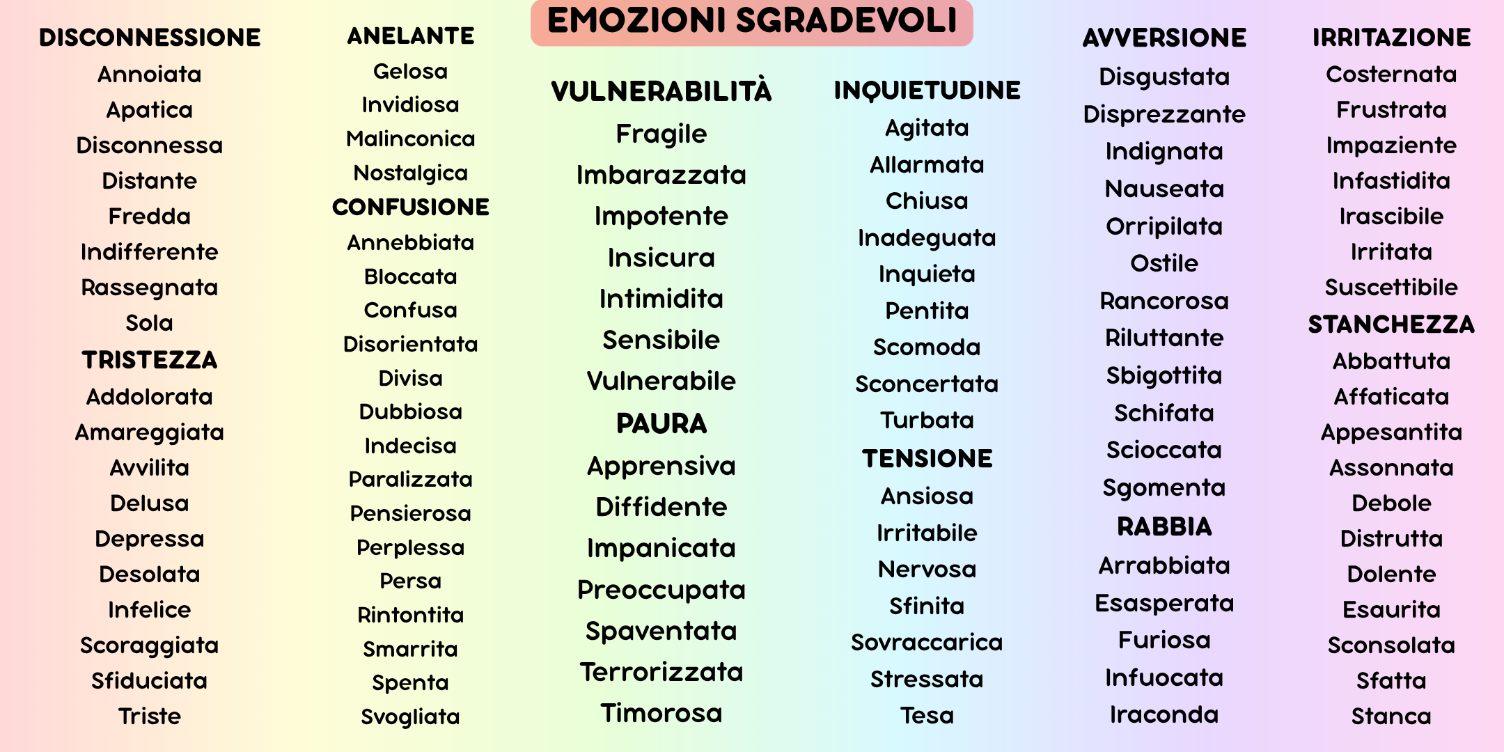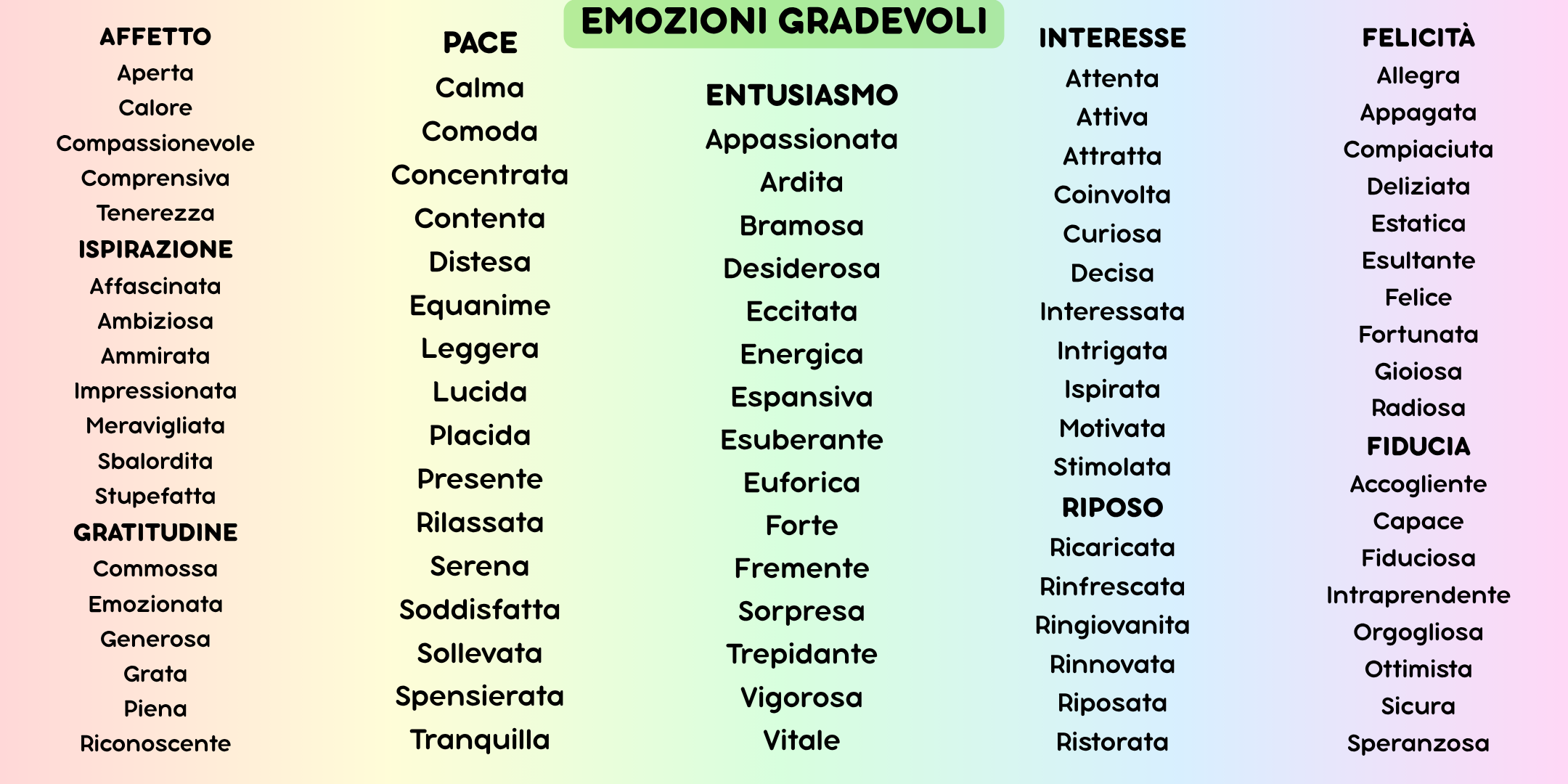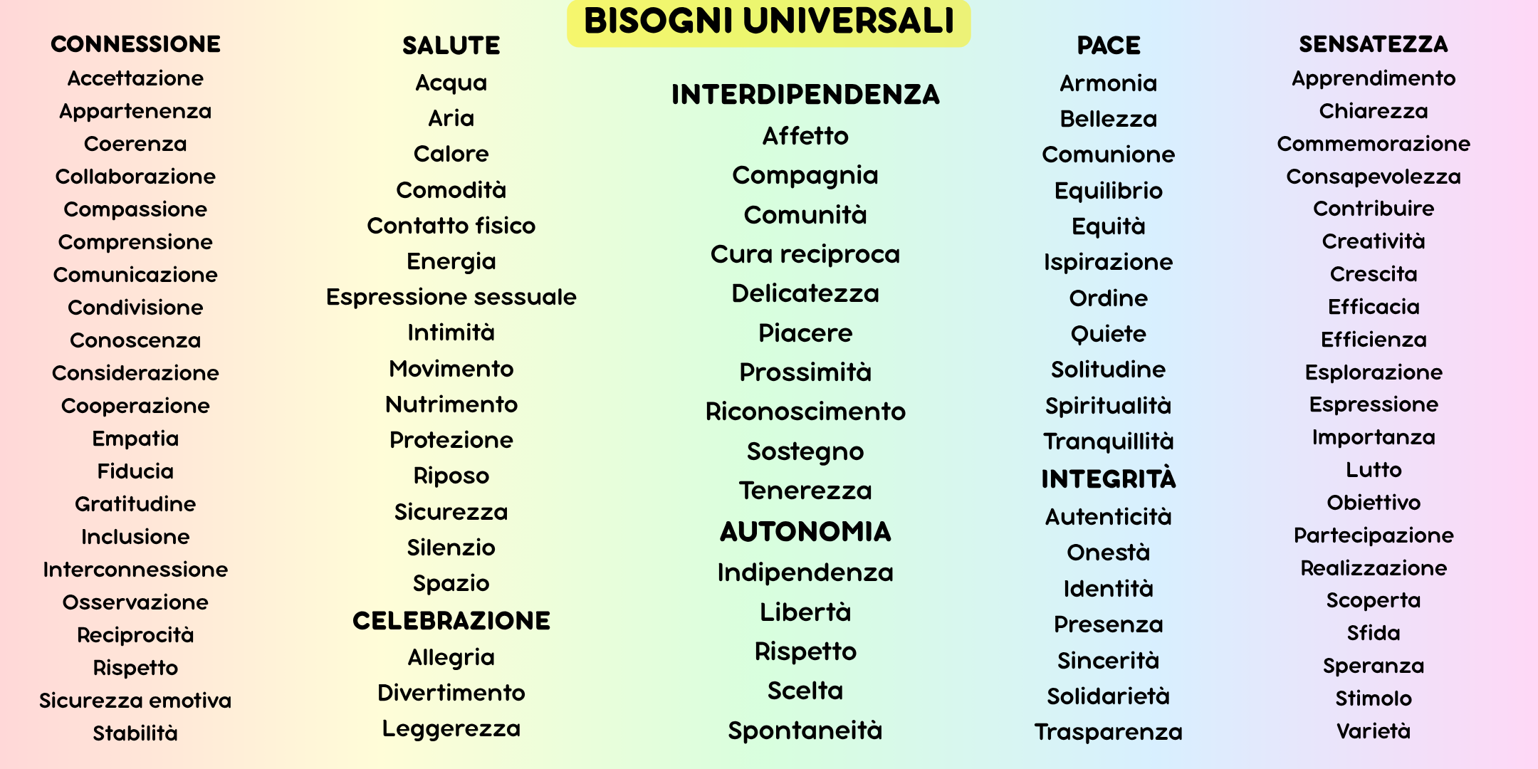 Ovvero una lista di quelli che possono essere i bisogni di base universali e delle emozioni umane ordinate in categorie.