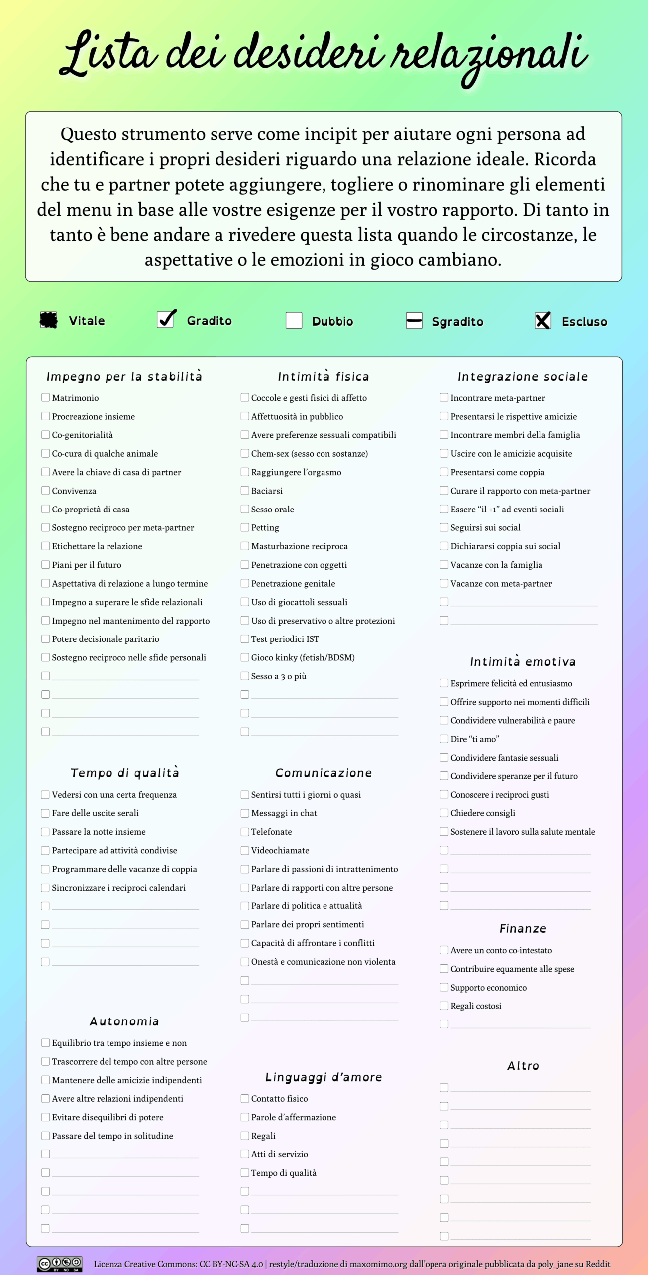 Ovvero una scheda “per mettere le cose in chiaro, nero su bianco” esprimendo le nostre preferenze su cosa vorremmo o meno nei nostri rapporti più significativi.