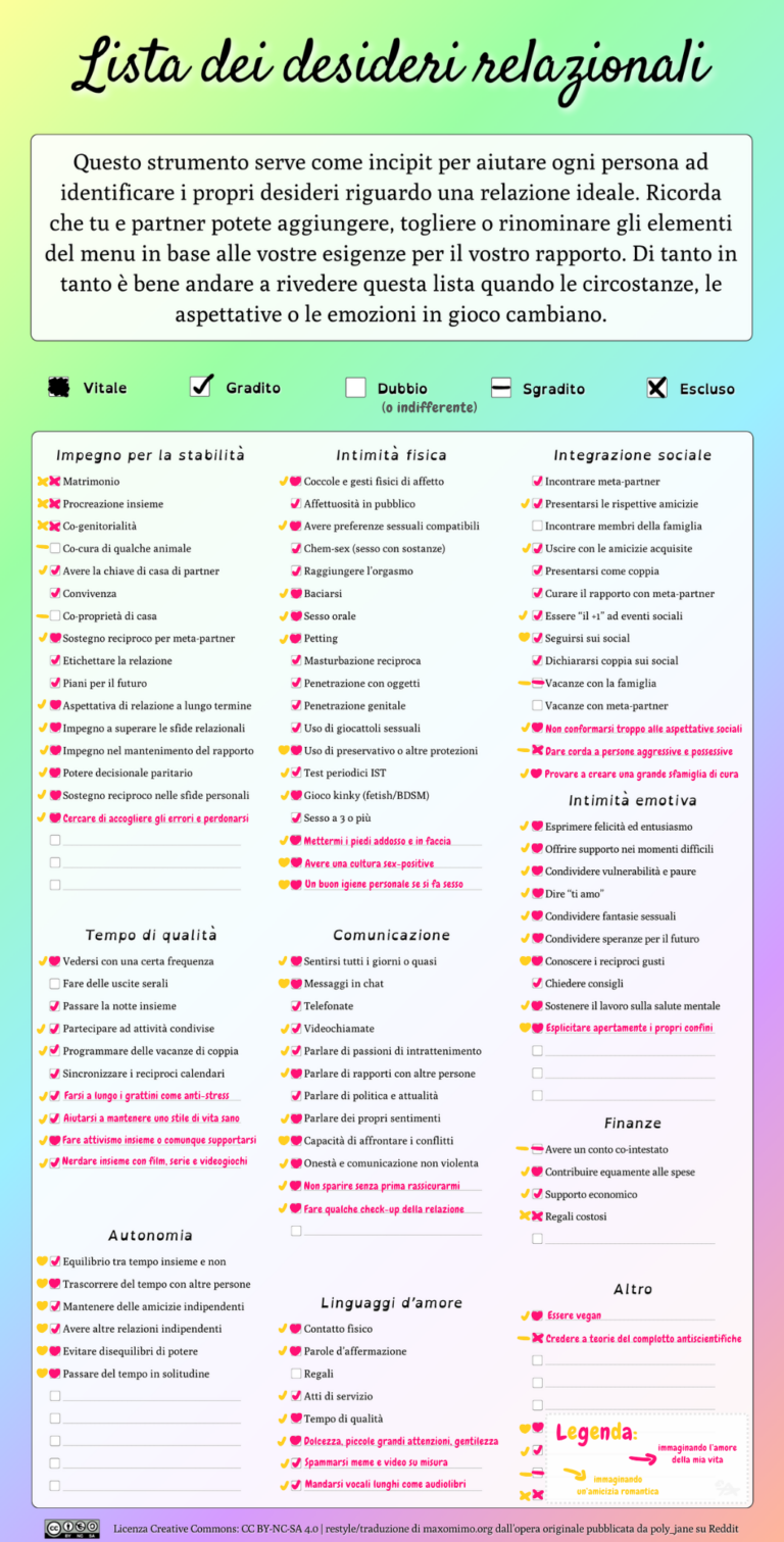 Era il 9 novembre 2025 quando una persona che stavo iniziando a conoscere mi citò uno schemino fatto di caselle da spuntare che scoprì tramite il gruppo Telegram della community di FAQ the Poly, un duo di podcaster che risponde a svariate domande a tema poliamore. Lo schema era questo qui, caricato su Reddit dall’utente poly_jane. Nei commenti del post ho trovato anche la variante in foglio di calcolo e una web app creata da un altro utente. Tutti in inglese.